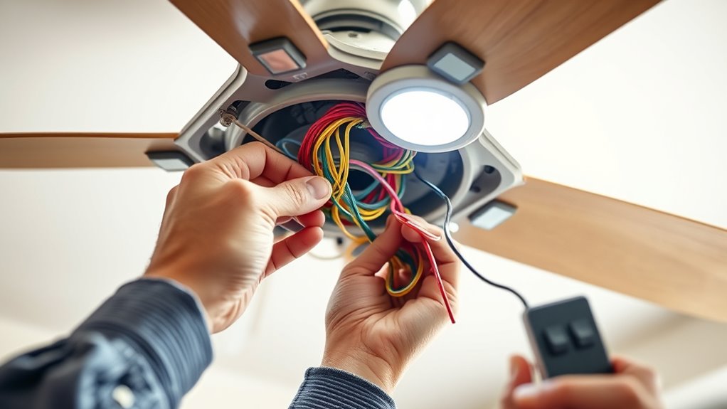 To safely wire a ceiling fan, start by turning off the power at the breaker and verifying no current with a voltage tester. Understand wiring color codes: black (hot), white (neutral), green or bare copper (ground), and blue or red (light or separate control). Connect wires securely with wire nuts and make certain the fixture is properly grounded. For complex setups like remote control or multiple switches, follow detailed wiring guides. Continuing will help you master safe installation and troubleshooting techniques.